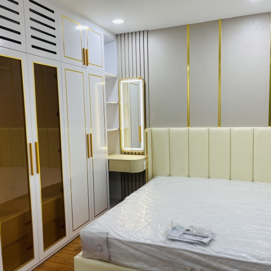 • Khung làm từ gỗ MDF phủ Melamine , cánh làm từ gỗ MDF phủ Acrylic bóng gương làm tăng độ sang trọng và thẩm mỹ hơn.